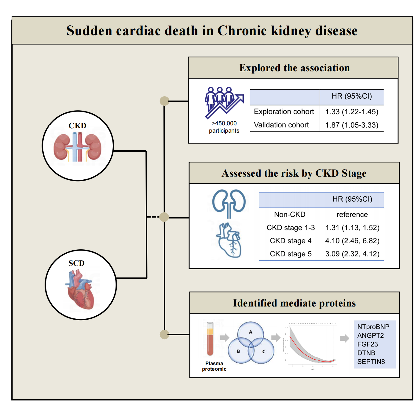 2023年美国心脏协会提出的CKM综合征,系统阐释了代谢异常、慢性肾脏病与心血管系统之间的病理生理联系。"肾-心轴"作为核心机制显著提升了终末期事件风险。在各类心血管事件中,心源性猝死因高致死率而尤为突出,约20%的晚期CKD患者死于该病因。目前,针对不同分期CKD患者的心源性猝死风险研究仍较为有限。本研究基于中国本土纵向队列、国际前瞻性队列及蛋白组学数据,首次系统揭示CKD患者长期心源性猝死风险显著增加,且随疾病进展逐步上升。通过多队列蛋白组学分析,筛选出NT-proBNP与FGF23作为潜在生物标志物。研究强调,对CKD患者的临床管理除延缓肾功能进展外,还应将定期心电图监测等综合策略纳入常规管理,以降低心血管风险。该成果是继2023、2024年课题组阐明癫痫所致心律失常后,在心脏重大疾病研究领域的又一系统性突破(中南大学湘雅三医院为第一单位和最后通讯单位;陆瑶教授为本文的最后通讯作者;陆瑶团队博士研究生李雅岚为本文的第一作者)。