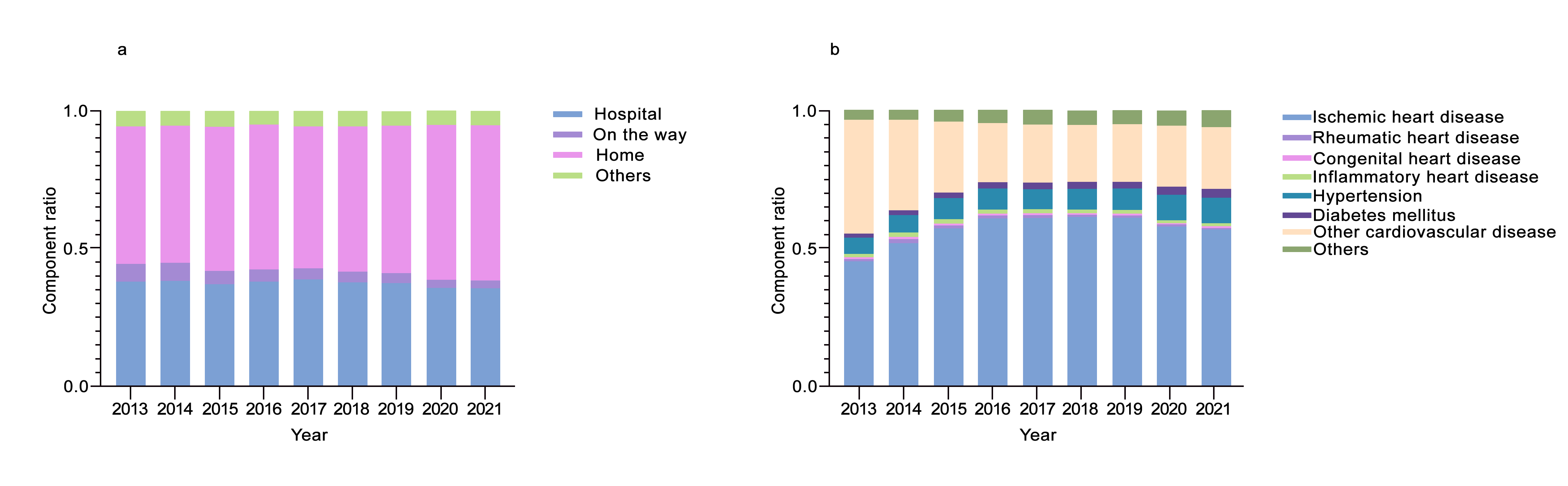 心源性猝死发病突然、其死亡率超过90%,对公众生命健康构成重大威胁,然而长期以来我国缺乏全国层面的系统数据支撑防控工作。针对这一研究空白,陆瑶教授进一步与中国CDC慢病中心周脉耕主任团队合作,首次基于2013-2021年全国死亡监测数据系统揭示我国心源性猝死的疾病负担。结果显示我国心源性猝死呈持续加重趋势,年龄标准化死亡率从10.95/10万增至18.38/10万,其中男性发生率为女性1.7–1.8倍,65岁以上老年人风险显著增高。研究指出约60%的心源性猝死与缺血性心脏病相关,且超过半数病例发生于院外,凸显我国在一级预防、高危人群早期干预及院外急救体系方面存在短板,亟需通过加强AED配置、普及CPR培训并优化应急响应机制以应对日益加重的疾病负担(陆瑶教授和中国CDC慢病中心周脉耕主任为本文的共同通讯作者,陆瑶团队博士研究生王婕为共同第一作者)。