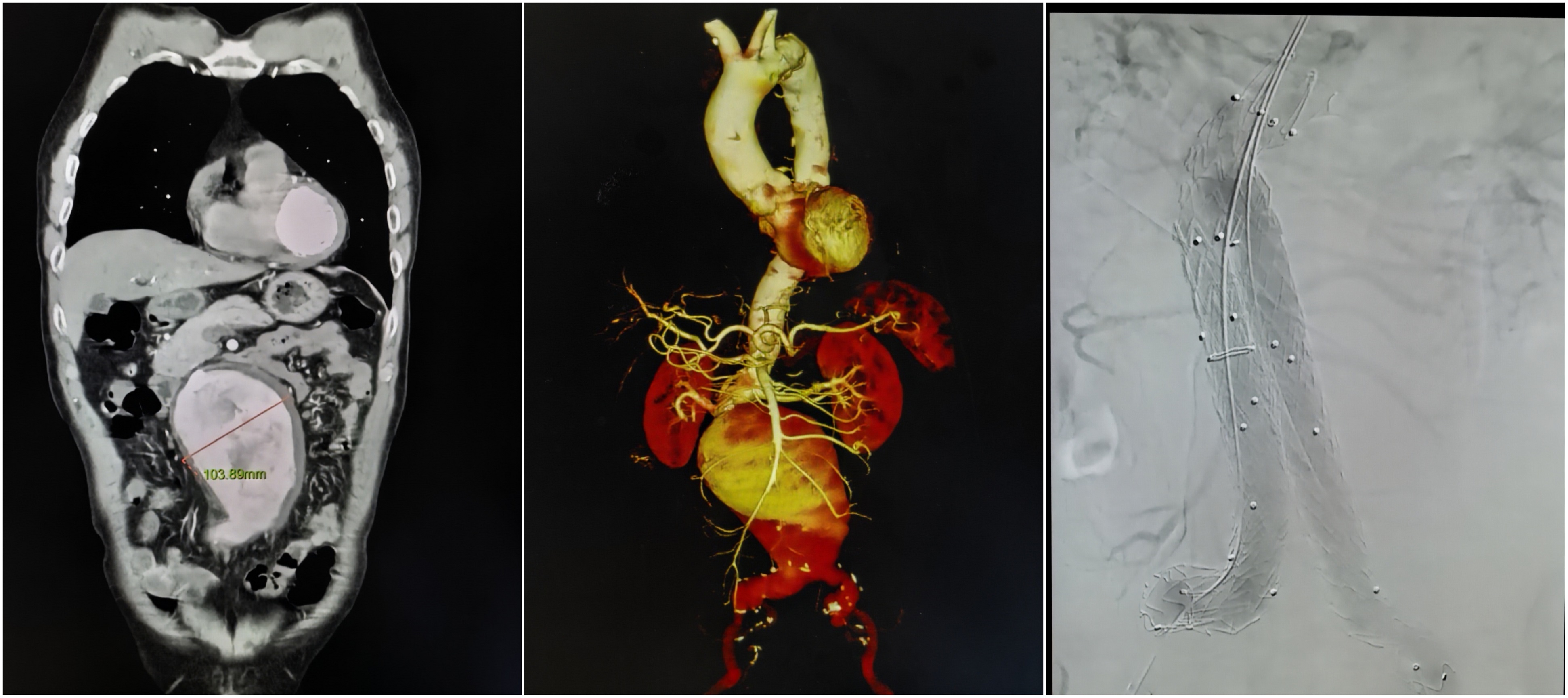 患者因腹胀就诊湘雅三医院,CT意外发现腹主动脉巨大动脉瘤,濒临破裂,病情危急,血管外科总住院薛碧晨第一时间赶赴急诊科接诊,血管外科副主任徐宏博迅速启动危重动脉瘤急救绿色通道,在急诊科、麻醉科、复合手术室大力配合下,争分夺秒完成术前准备。随后,血管外科主任姚凯带领徐宏博、王智超、薛碧晨组成的“拆弹部队”仅用一个多小时,通过三个小于1cm的小切口完成微创介入手术,成功隔绝动脉瘤,复查无任何内漏,手术圆满成功。术后患者生命体征平稳,恢复情况良好,于今日从ICU顺利转回普通病房,恢复下地行走。