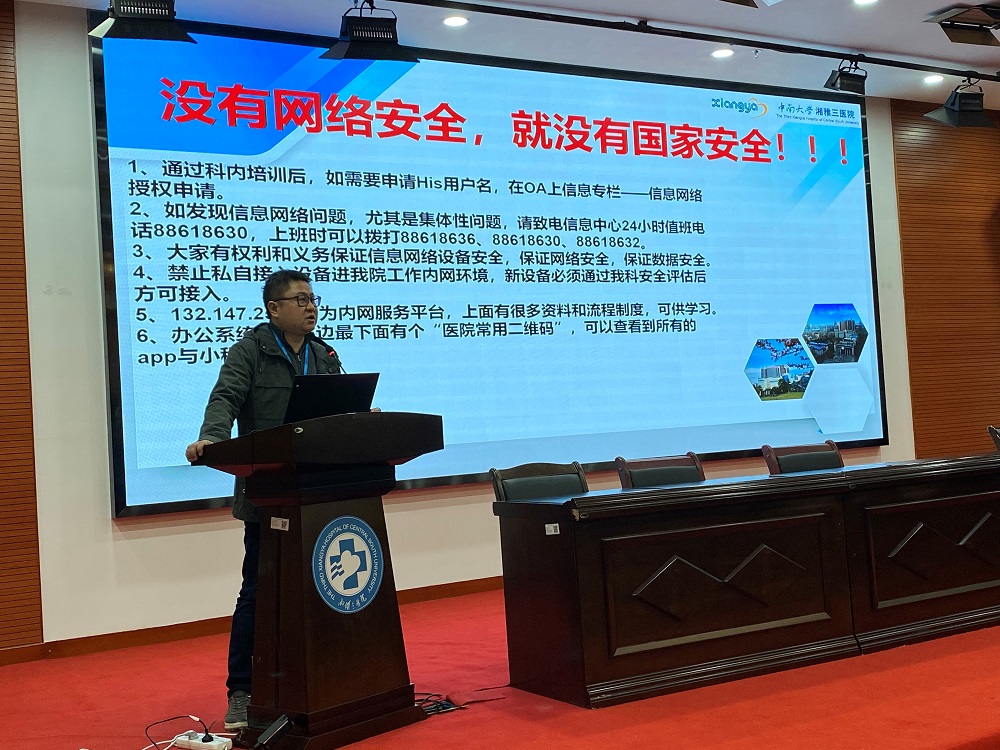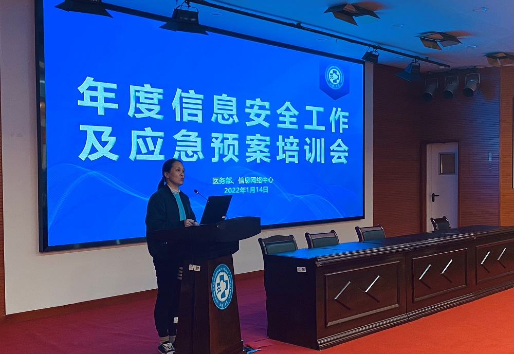 1月14日,中南大学湘雅三医院医务部、信息网络中心组织召开全院年度信息化安全工作及应急预案培训会。为严格履行国家及医院疫情防控要求,减少培训会现场的人员聚集,本次培训会采取“线上+线下”结合的模式召开,全院总住院、护士长、相关管理部门负责人及信息第一责任人参加了此次培训,各临床科室线上收看。会议由医院信息网络中心主任王安莉主持。