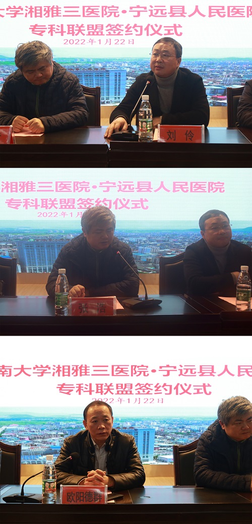 1月22日,中南大学湘雅三医院与宁远县人民医院建立血液净化紧密型专科联盟并进行签约授牌仪式。永州市卫健委主任欧阳德群,宁远县县长毛政,中南大学湘雅三医院社会服务中心主任刘伶、副主任佘彩婷,肾病风湿病科主任张浩、副主任兼血液净化中心主任王建文以及科室团队,宁远县人民医院党委班子、各科室负责人出席了签约及授牌仪式。