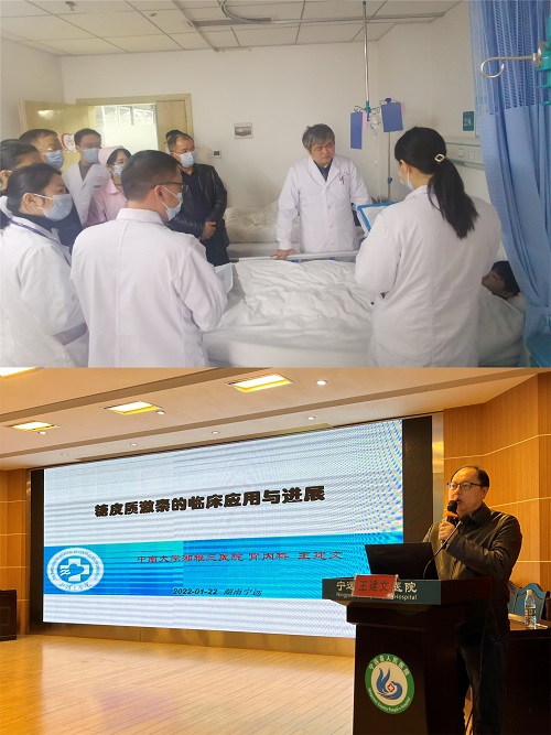 签约仪式后,张浩、王建文深入肾脏内科病房查房,针对疑难病人进行了病情诊断,提出了治疗方案、临床用药等多方面的指导意见,王建文就《糖皮质激素的临床应用与进展》进行专题授课。血液净化中心徐勇医生现场进行了尿毒症患者动静脉内瘘PTA手术、长期导管置入等4台手术指导。王露芳主管护师针对血液净化中心的管理提出了一些合理化意见。
