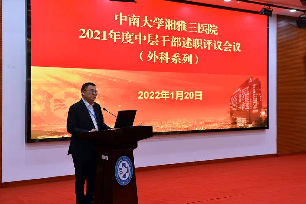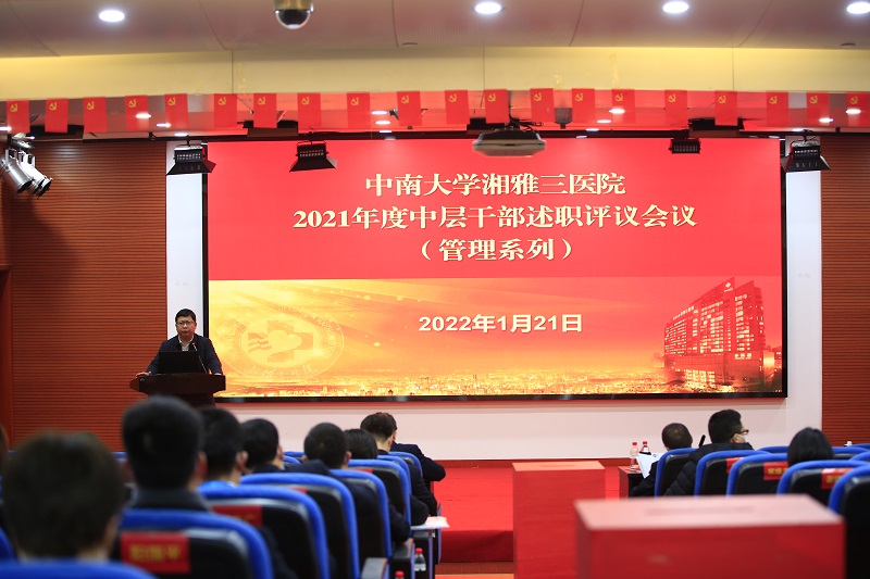 1月19至21日,中南大学湘雅三医院在外科楼二楼学术报告厅组织召开2021年度中层干部述职评议会议。党政管理部门正职、业务科室负责人以现场述职的方式向医院领导班子述职,中层干部副职以书面述职的方式向医院领导班子述职。医院领导班子成员、各党总支书记及全体中层干部参加会议。会议由医院党委副书记杨飞龙主持。