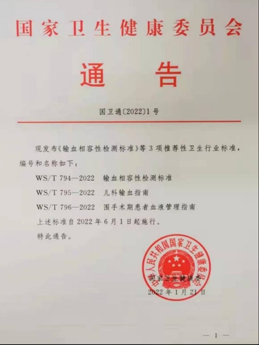 2022年1月21日,国家卫健委发布[2022]1号通告,由中南大学湘雅三医院牵头的制定的《儿科输血指南》,参与制定的《输血相容性检测标准》《围手术期患者血液管理指南》等3项推荐性卫生行业标准正式发布。