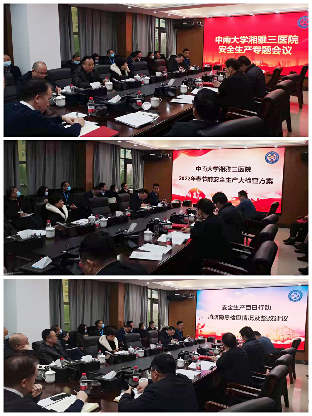 春节前夕,为确保春节期间医院的医疗安全,1月25日上午,医院召开“2022年中南大学湘雅三医院安全生产专题会议”,旨在深入贯彻落实省委省政府及省卫健委对春节前加强安全生产工作做出的重要指示批示精神,安排布置各项工作,深入推进岁末年初安全生产百日大会战工作,营造一个安全稳定的社会环境。院领导、安全保卫部、后勤保障部、医务部、护理部等相科室负责人参加会议。
