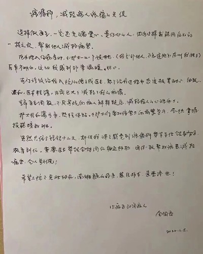 作为医务工作者,看到每位患者恢复健康,平平安安回家,是我们最大的心愿。年前科室还收到了一位老娭毑手写的一封特殊来信——“疼痛科,减轻病人疼痛的天使”,信中朴实的文字,表达着对疼痛科全体医护人员的感激之情。医护人员对她无微不至的关怀和照顾,特别是疼痛科主治医师倪云成、管床医生周毅精湛的医术,得到了这位娭毑的高度赞誉,正因如此,她年前如愿出院回家与家人幸福团聚,开开心心过大年!