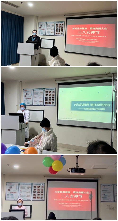 为迎接三八妇女节,倡导健康生活方式,增强女性乳腺保健意识,3月7日下午,在中南大学湘雅三医院外科楼17楼示教室,湘雅三医院团委、普外肝胆胰乳甲外科党支部在医院外科楼17楼示教室联合开展了以“关爱乳腺健康 塑造美丽人生”为主题的职工与病友关怀节日活动。活动由乳甲外科护士长王玲主持,特邀普通外科副主任丁波泥教授,团委书记程海威,乳甲外科主管护师陈雪梅、余隽、彭欢等人参与活动。此次活动共有职工、病友及家属约50余人参加。