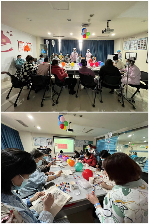 程海威做开场讲话,为患者送上了真心的问候和祝福,同时肯定了乳甲外科近年来在科室人文建设与公益关怀活动方面的工作成果。活动开始后,第一个环节是趣味减压活动“环保袋涂鸦”制作,粉色的爱心气球、寓意美好的祝福语将活动现场装点得节日氛围浓厚,手工DIY制作很快吸引了大家的注意力。医护人员与病友们共同协作,大家学得非常认真,做得也很开心,现场氛围十分融洽,病友们脸上展露出满满的成就感与喜悦感。