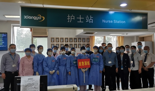 3月15日,根据国家、省、市卫生健康委关于落实常态化疫情防控措施及《湖南省突发公共卫生事件应急预案》和中南大学湘雅三医院新冠肺炎疫情防控的相关要求,结合当前湖南省新冠肺炎疫情防控形势日益严峻的实际情况,为落实《近期湖南省新冠肺炎医疗救治重点工作提醒的通知》,有效降低新冠肺炎在院内的传播风险,规范医务人员行为与提升应急处置能力,医院在内分泌科六病区组织开展了住院患者陪护确诊为新冠肺炎病例的应急演练。演练由党委委员、副院长欧阳文部署,医务部、护理部牵头组织,内分泌科主任金萍主持。医院感染控制中心、安全保卫部、后勤保障部、医学装备部、发热门诊、感染科、检验科等职能部门负责人及相关临床科室共同联动配合参与了此次应急演练,全院各科室约40余名医护人员到场观摩学习。