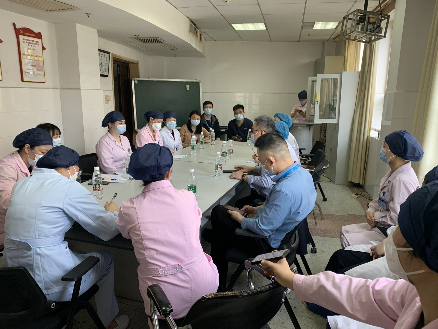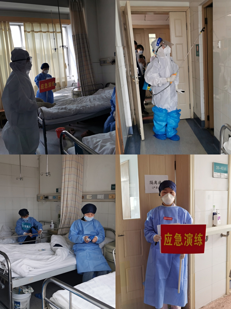 此次演练模拟情景为一名住院患者的陪护入院前在医院行新冠核酸检测结果为阴性,湖南省居民健康卡二维码及行程码均为绿色,入院第二天科室护士常规排查双码时发现其湖南省居民健康码变成红色,按防护要求护送其去发热门诊,核酸检测结果为阳性,确诊为新冠肺炎病例,立即严格防护下转入定点隔离医院,同时内分泌病房护士站接到医务部电话通知,立即全员启动普通病房出现新冠疫情应急预案。