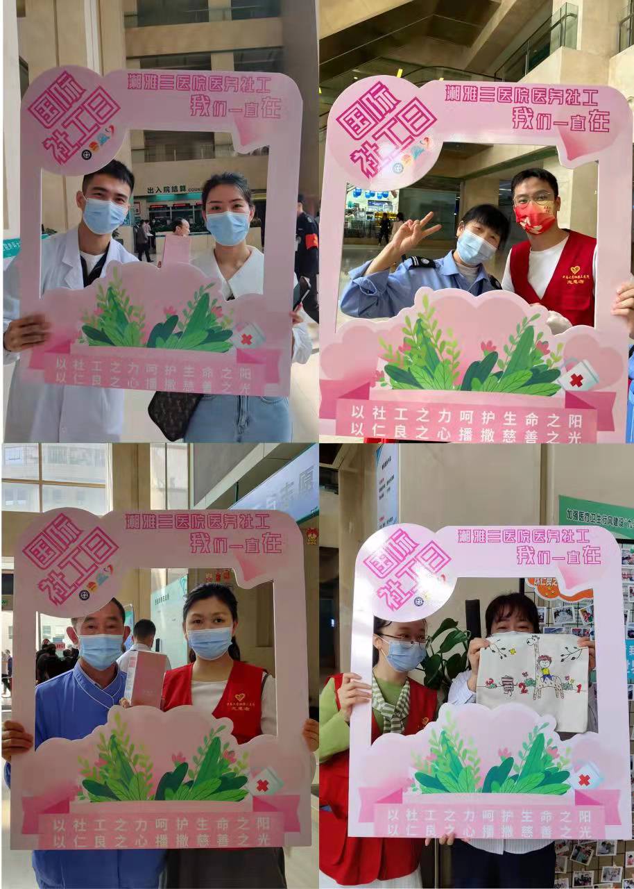 2022年3月15日是第十六个“国际社工日”,为贯彻落实习近平总书记关于社会工作的重要指示精神,宣传社会工作专业优势,展示社会工作发展成果,根据上级组织要求,中南大学湘雅三医院医务社工指导中心、志愿服务指导中心、团委联合社工机构及公益伙伴在医院举办了“我在”国际社工日主题宣传活动。活动旨在展示近年来医院医务社会工作所取得的经验成果,弘扬社会工作精神,提高职工及民众对社会工作的知晓率、参与度和认同度。数百名职工、患者和家属参与了此次活动。