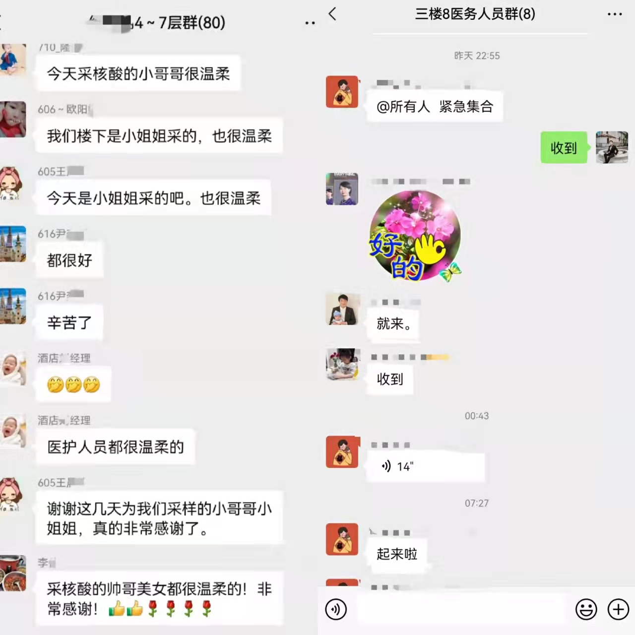 隔离对象和医务团队每天需要进行鼻咽及口咽核酸采样,鼻咽采样受检者不适感更明显,尤其是患有鼻部过敏和鼻息肉的人会感到更加难受。团队中作为耳鼻喉科医生的陈潇雅,给大家普及了取样的一些特别注意事项以及如何轻巧地留取鼻拭子,减少不适症状,并且督促大家相互取样练习,交流感受和需要改进的地方。付出努力的收获明显,改进采样技巧后,团队收到了更多隔离对象的表扬和赞许。自驻守酒店以来,陈潇雅医生公开自己的电话号码,并保持24小时电话畅通,方便隔离人员有问题时及时联系。并且,她悉心问诊有基础疾病的隔离人员,了解既往病史和目前服药情况,确保他们随身带有药品,并指导用药,受到隔离对象一致好评。此外,团队还要关注隔离对象在微信群里的聊天记录,随时为隔离人员排忧解难。微信群里甲状腺癌术后的隔离对象询问优甲乐如何吃、吃多少的问题,陈潇雅医生专业又细心地回答问题、耐心指导。这些举动,无不展现了湘雅三医院人的专业技能和人文情怀。