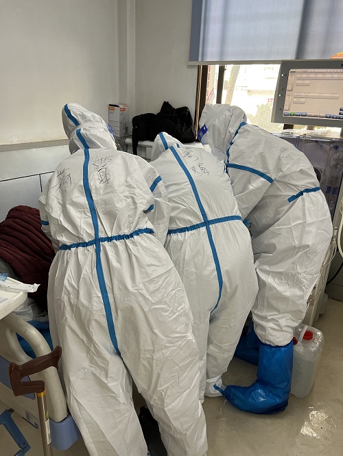 3月31日早上赶到康复医院后,具有丰富透析经验的主管护师易媚被任命为此次任务的护理组长。易媚意识到由于隔离的原因会导致透析病人透析间期拉长,会出现心衰、高钾等情况。时间就是生命,一分钟也不能怠慢。她立即组织来自各家医院的护士培训穿脱防护服、熟悉环境、熟悉病人 、熟悉工作人员、熟悉机器、整理用物,重点落实透析病人的预检分诊工作以及院感防控工作。于下午四点正式开始了第一班11个透析病人的治疗工作。
