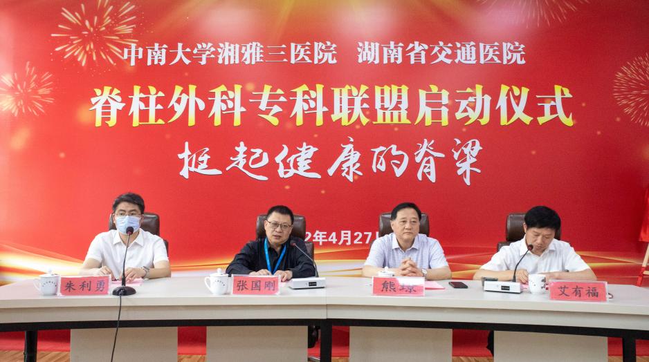 4月27日上午,“中南大学湘雅三医院、湖南省交通医院脊柱外科专科联盟启动仪式”在湖南省交通医院办公楼三楼远程会议室举行。