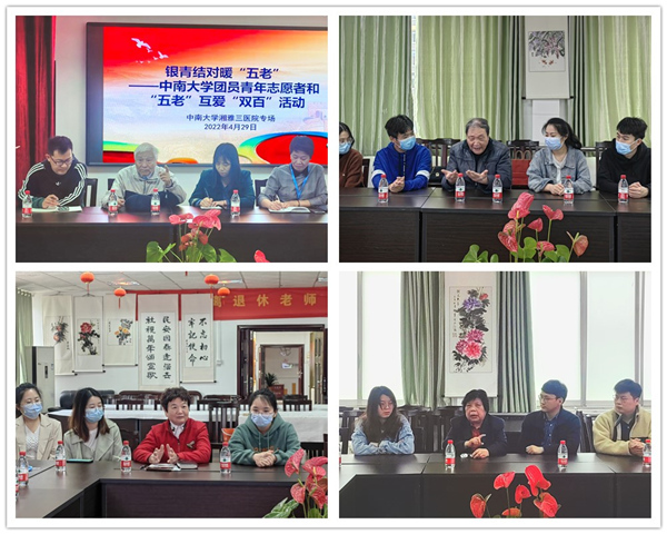 4月29日上午,在“五四”青年节及“五一”劳动节来临之际,中南大学湘雅三医院团委和医院关工委在离退休活动室(关工委成果展览室)开展了银青结对暖“五老”——团员青年志愿者和“五老”互爱“双百”专场活动。活动由湘雅三医院离退休党总支书记兼关工委秘书杨华与院团委委员戴萍萍主持,邀请了关工委特邀党建组织员、医院原党委书记杨伯勋,关工委特邀党建组织员、医院原院长刘浔阳,关工委常务副主任、医院原党委书记郑兰香,医院特邀党建员、原护理学院党委副书记巫爱琳等“五老”代表出席活动,院离退休办主任屈俊珍、副主任杨梦卿,院团委学生兼职副书记舒玉锋、学生团总支常务副书记臧龙军及团总支、研究生会学生干部、团员青年志愿者们共同参加了活动。