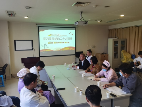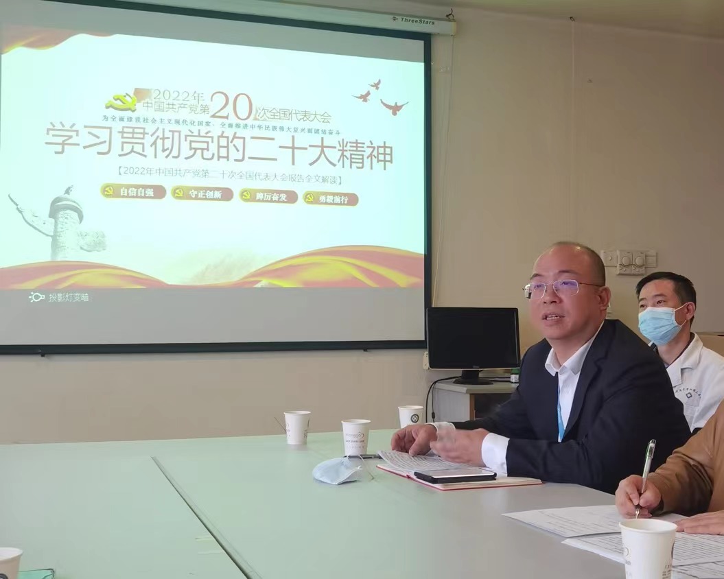10月28日,湘雅三医院第五党总支神经外科党支部在外科楼九楼示教室开展主题党课活动,集中学习研讨二十大精神。医院党委副书记、纪委书记张劲强出席并讲课,第五党总支书记余希、神经外科党支部书记王知非、支部党员、入党积极分子、发展对象及部分医护人员参加学习研讨。