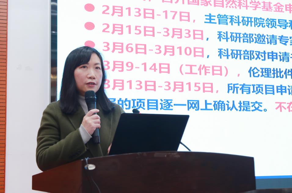左笑丛副院长对2023年医院国家自然科学基金申报的具体工作进行部署。她号召各科室积极挖掘科研人员,尤其是青年医生的潜力,充分利用学科优势,参加标书撰写培训会及标书预评审,积累经验、提升标书写作能力。同时,要求医院科研部陆续开展相关系列专题讲座,为科研工作者申报国自做好精细化服务。