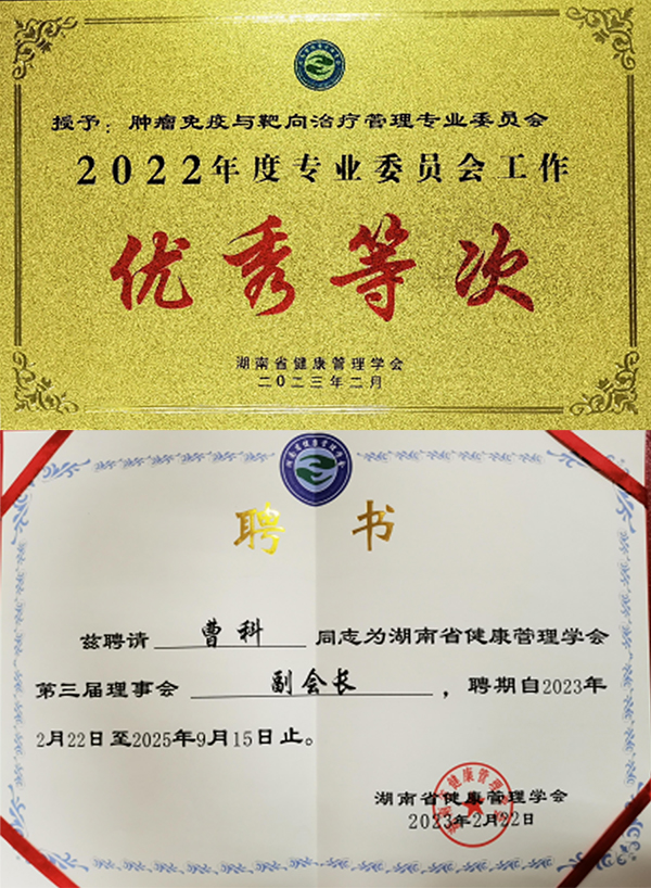 2月22日,湖南省健康管理学会在长沙召开第三届四次理事会十三次常务理事会暨2023年度主委联席会议。中南大学湘雅三医院作为主委单位的肿瘤免疫与靶向治疗管理专业委员会从56个专委会中脱颖而出,荣获“2022年度绩效考核优秀等次”表彰。同时,经理事会表决,增补专委会荣誉主任委员曹科为学会副会长,专委会主任委员肿瘤科副主任(主持工作)兼放疗中心主任刘学文为学会常务理事,专委会秘书唐情男、宋泽文为学会理事。