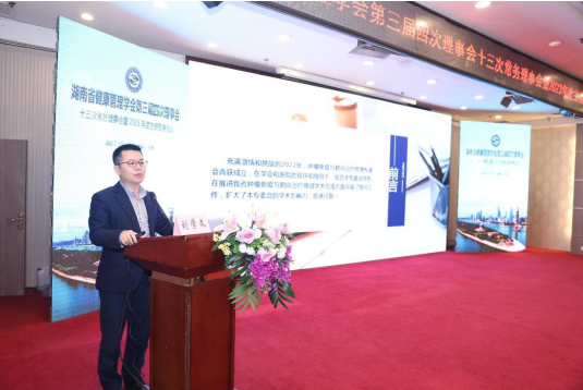 受大会邀请,中南大学湘雅三医院肿瘤科刘学文代表肿瘤免疫与靶向治疗管理专业委员专委会在大会上做专委会工作经验报告,并向与会的200余位省内外专家介绍了新湘雅肿瘤科的发展现状与未来规划。