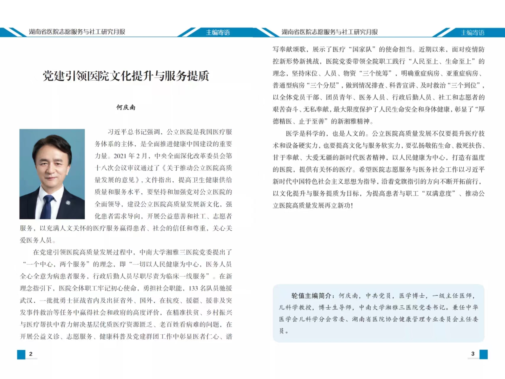 何庆南党委书记高度重视医院医务社工与志愿服务工作,在本期专刊中以“党建引领医院文化提升与服务提质”为题发表主编寄语。他指出:在党建引领医院高质量发展过程中,中南大学湘雅三医院党委提出了“一个中心,两个服务”的理念,引领全体职工牢记初心使命,勇担社会职能,在抗疫、援疆、援非及突发事件救治等任务中赢得社会和政府的高度评价,在精准扶贫、乡村振兴与医疗帮扶中着力解决基层优质医疗资源匮乏、老百姓看病难的问题,在开展公益义诊、志愿服务、健康科普及党建群团工作中彰显医者仁心、谱写奉献颂歌,展示了医疗“国家队”的使命担当。全体党员干部、团员青年、医务人员、行政后勤人员、社工和志愿者,践行“人民至上、生命至上”的理念,艰苦奋斗、无私奉献,最大限度保护了人民生命安全和身体健康,彰显了“厚德精医、止于至善”的新湘雅精神。他强调:医学是科学的,也是人文的。希望医院志愿服务与医务社会工作以习近平新时代中国特色社会主义思想为指导,沿着党旗指引的方向不断开拓前行,以文化提升与服务提质为目标,为提高患者与职工“双满意度”、推动公立医院高质量发展再立新功。