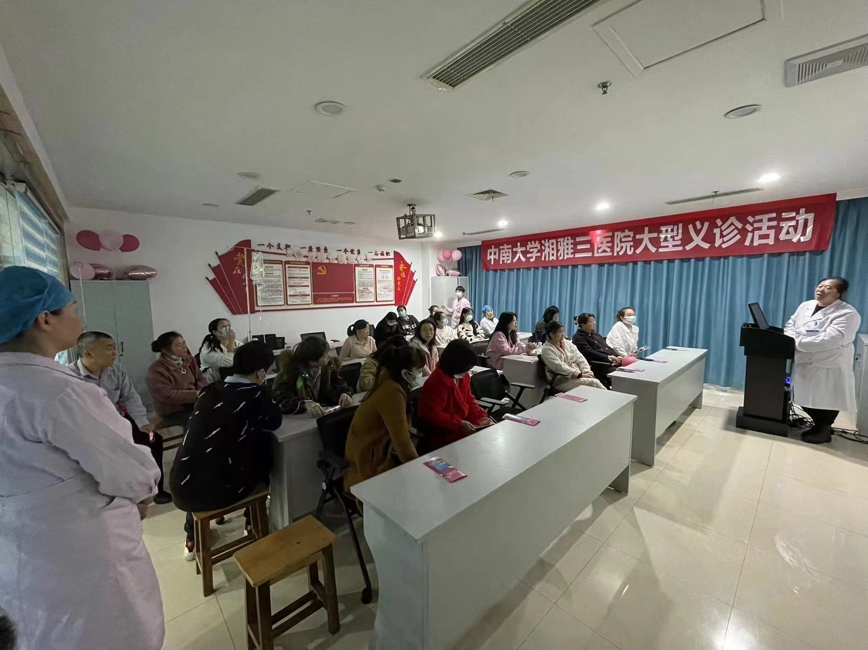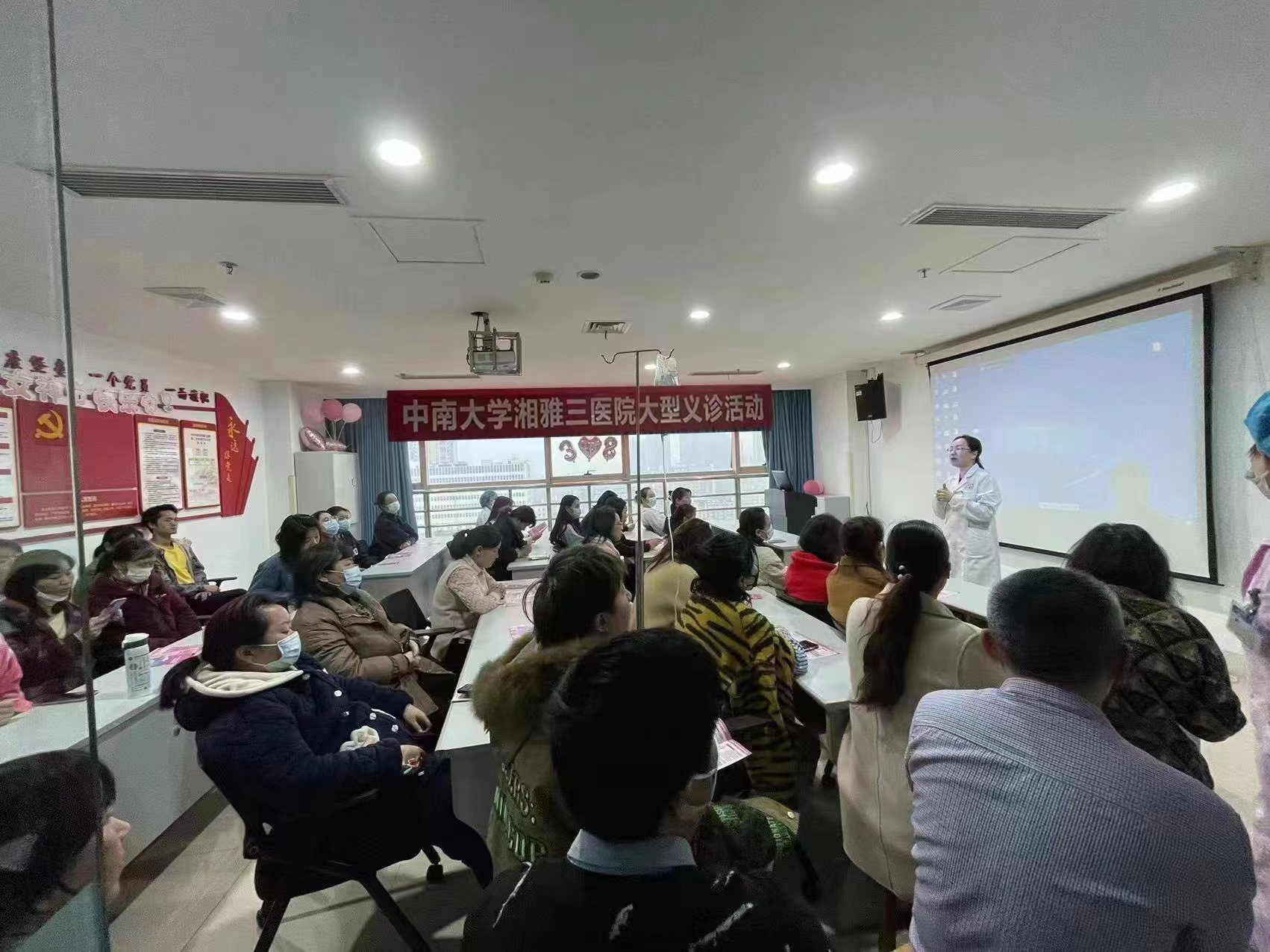 为庆祝国际“三八”妇女节,倡导健康生活方式,增强女性自我保健意识,中南大学湘雅三医院妇科于3月8日上午在外科楼11楼示教室进行免费义诊活动,与广大的女性朋友来了一场浪漫的“春约“。副主任曾飞教授为义诊活动致辞,副主任医师冯晴以“浅谈子宫内膜异位症”的主题为患者授课,活动由护士长戴婵媛主持。