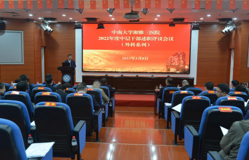 为进一步贯彻落实新时代好干部标准,加强医院干部队伍建设,强化干部考核监督力度,激发创优争先、干事创业的工作热情,3月1日和3月8日,中南大学湘雅三医院在外科楼二楼学术报告厅组织召开2022年度中层干部述职评议会议。全体院领导出席会议,各党总支书记及全体中层干部参加会议。会议由医院党委副书记杨飞龙主持。