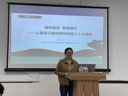 第五党总支书记余希在党课后作了总结发言,余希强调,基层党组织要切实把党的二十大精神讲清、讲准、讲透、讲实,持续加强思想政治引领,全体党员要把党的二十大精神立足岗位、落于实际,引导全体教职工进一步理解掌握党的二十大精神的精髓要义和丰富内涵。