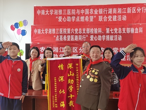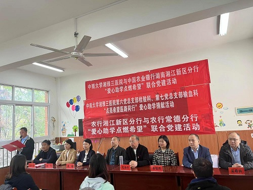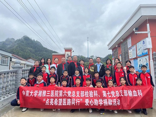 4月4日,中南大学湘雅三医院输血科和检验科在第六党总支部书记余智萍、第七党总支部书记毛赤丹和第八党总支部书记钟华的带领下,赴湖南省常德市石门县太平镇二房坪完小进行“点亮希望医路同行”爱心助学捐献活动。此次活动由“全国先进工作者”、湖南省第八至十二届人大代表、2005年度中国十大法治人物、2011年全国道德模范提名奖获得者陈建教负责联系,中国农业银行湖南湘江新区分行、中国农业银行常德分行、中国农业银行石门分行多次与中南大学湘雅三医院输血科共同为山区贫困留守患病儿童提供就医和医疗费用的援助。
