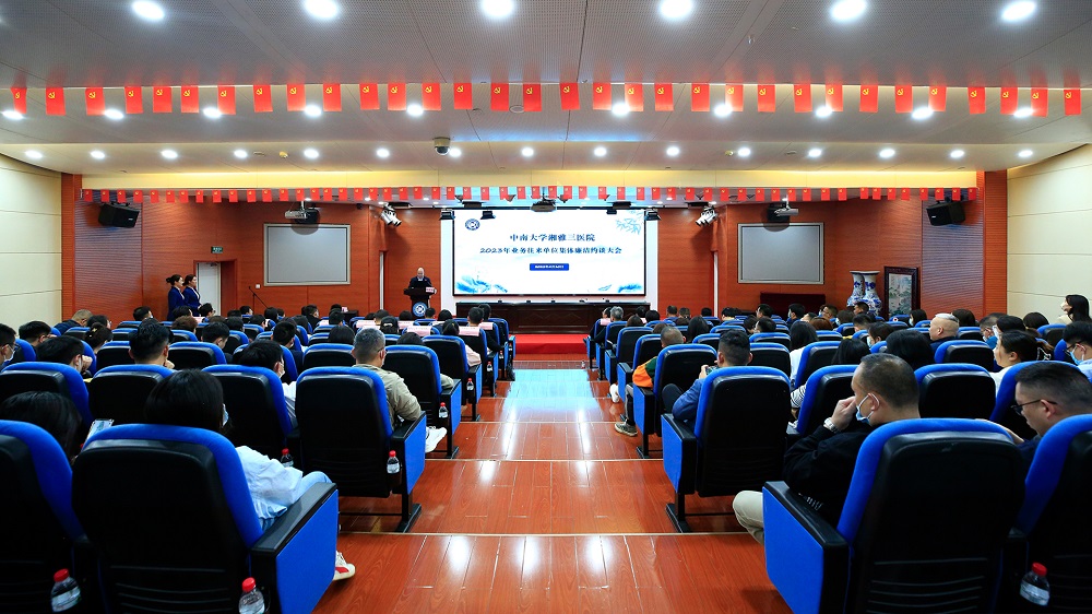 4月10日,中南大学湘雅三医院外科楼二楼会议室座无虚席,医院在此举办2023年业务往来单位集体廉洁约谈大会。院领导江泓、张劲强、孙传政,院纪委委员、相关职能部门负责人以及医学装备、药学、基建、信息、后勤、保卫、招标等200余家业务往来单位代表参加会议。会议由副院长孙传政主持。