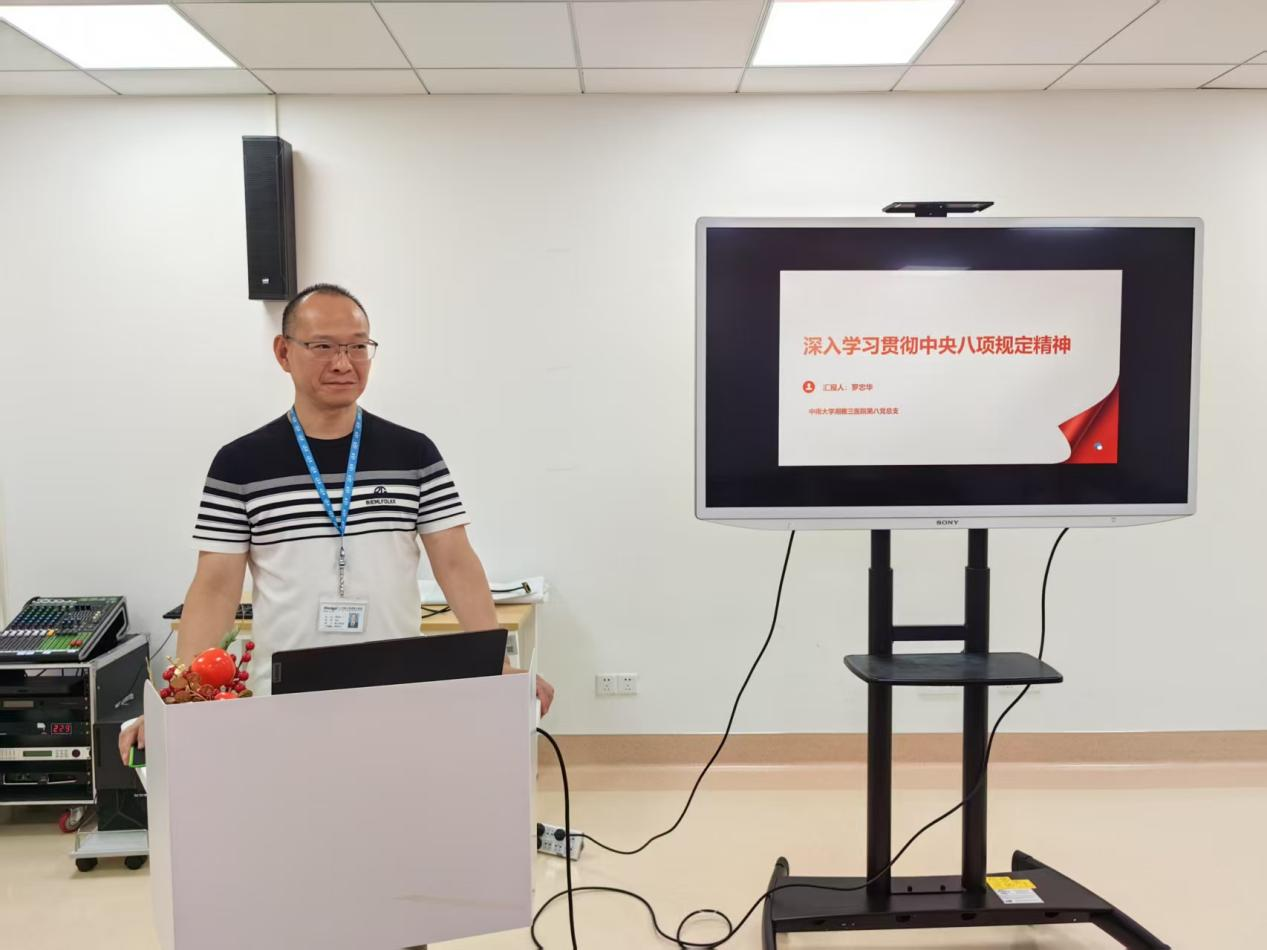 2025年6月30日,中南大学湘雅三医院第八党总支在门诊楼11楼召开深入学习贯彻中央八项规定精神专题党课。此次党课由医院党委委员、副院长孙传政授课,门诊综合党支部书记钟竹青主持,第八党总支全体支委及门诊综合党支部约50名党员参加学习,共学精神、共话担当。