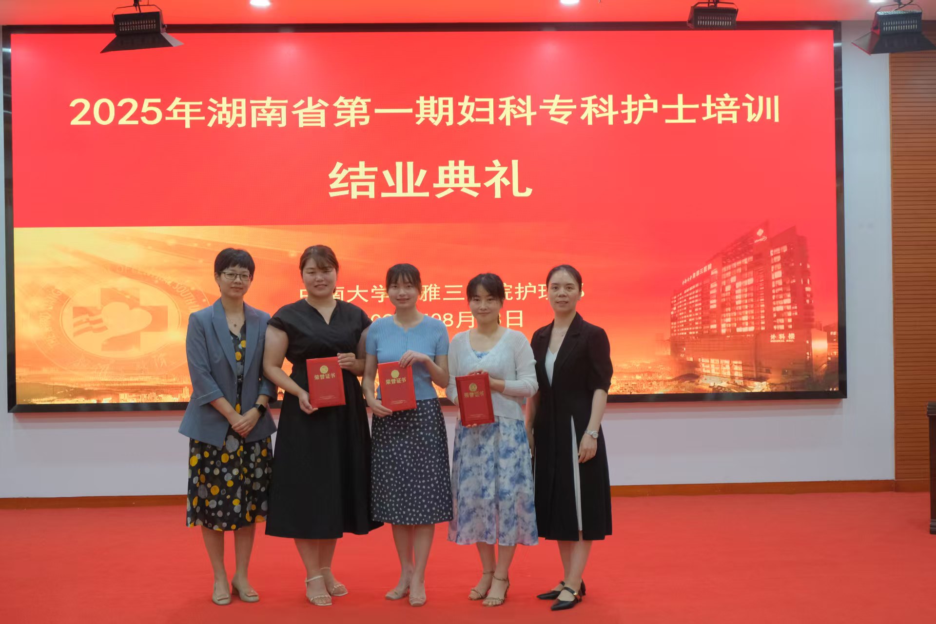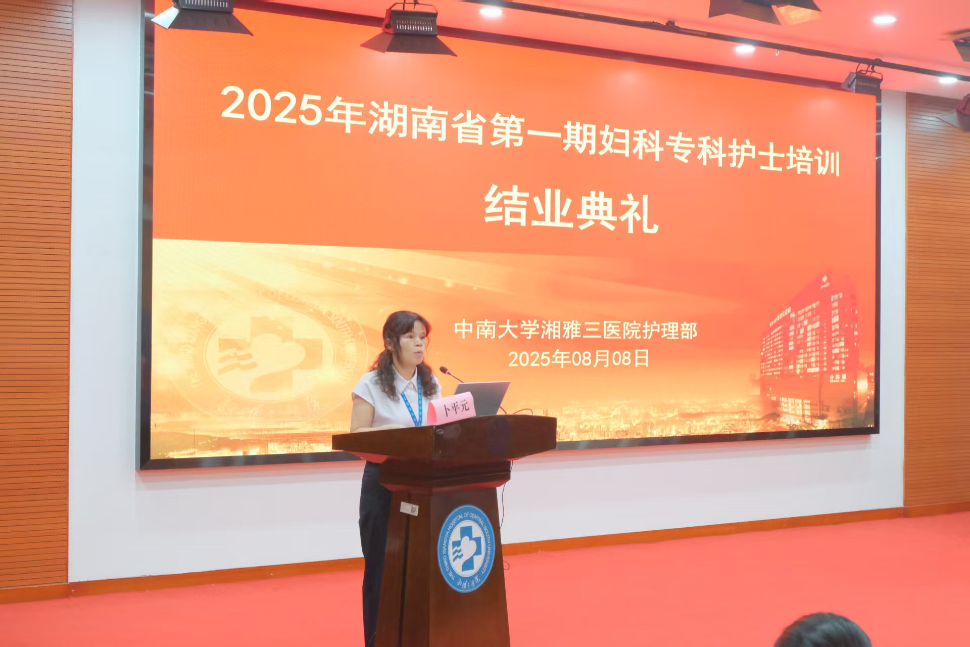 8月8日上午,2025年湖南省第一期妇科专科护士个案汇报暨结业典礼在中南大学湘雅三医院外科楼二楼学术报告厅成功举行。中南大学湘雅三医院妇科19病区护士长朱姝娟、21病区护士长张小红、妇科护理骨干及全体专科学员参会,结业典礼由护理部科护士长卜平元主持。
