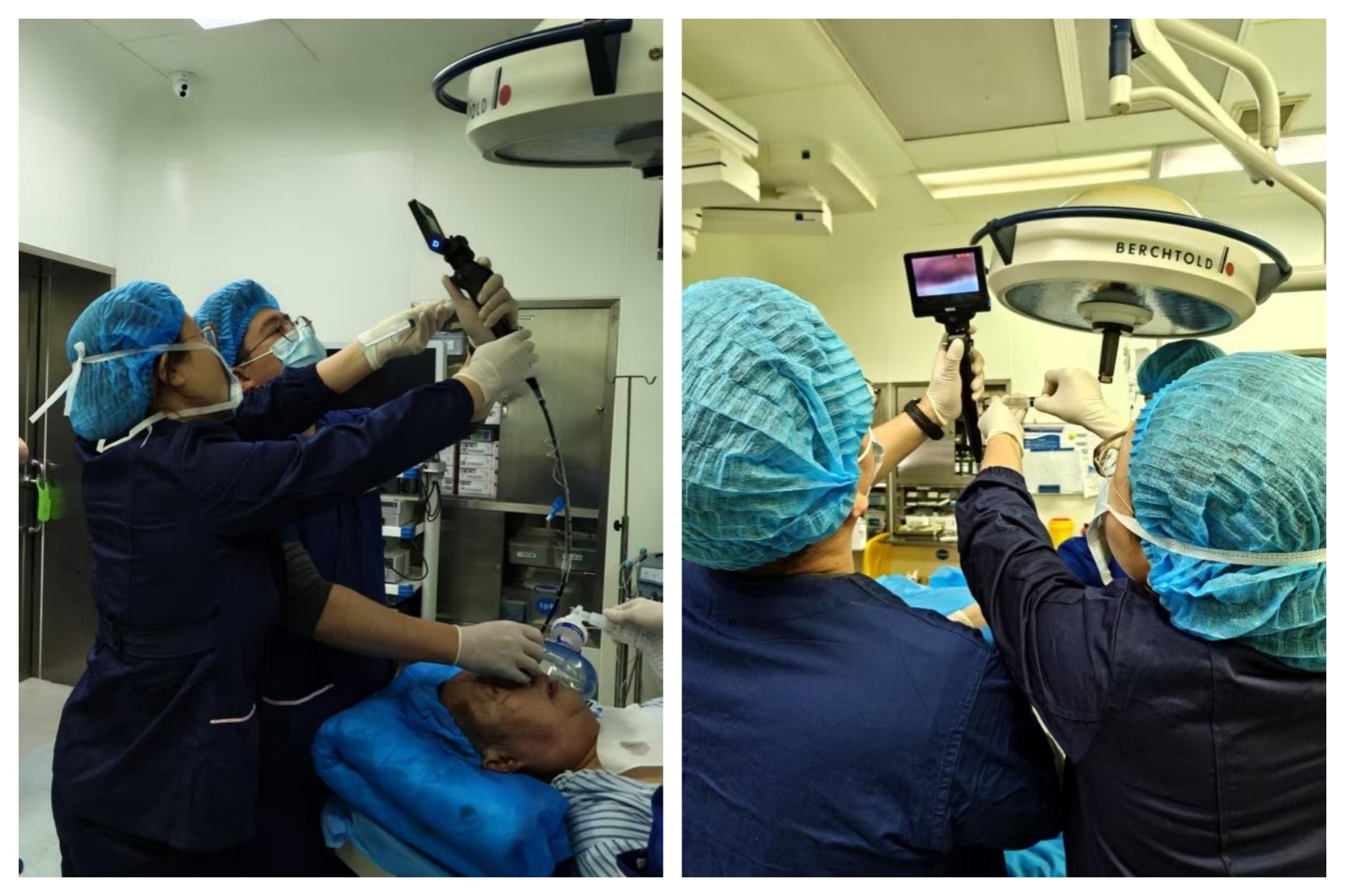 手术进入最关键的攻坚阶段。纤支镜的光束必须穿越因严重水肿而几近闭合的声门,任何微小的触碰都可能诱发致命的喉痉挛。“好,保持吸气,慢慢来……”张果教授屏气凝神,手指在控制器上精细移动。镜头在肿胀的组织间隙中谨慎探寻,如同暗夜中的探路者,奋力开辟生命的通道,在险象环生中架起一座希望的桥梁。