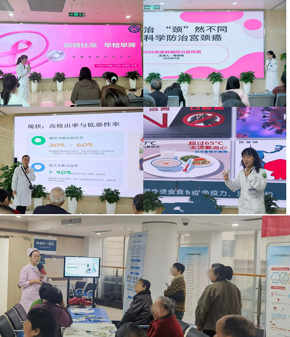 本次宣传周活动紧扣“早防早筛早治,同心携手抗癌”主题,通过义诊惠民、科普宣教、多科协作等形式,切实将防癌理念送到群众身边。肿瘤科主任刘学文表示,科室将以宣传周为契机,进一步深化与健康管理中心、门诊办等兄弟科室的联动,推动肿瘤防治关口前移,持续优化患者就医体验。未来,肿瘤科将继续依托亚专科优势和精准放疗平台,践行“以患者为中心”的服务宗旨,为助力“健康中国2030”贡献新湘雅力量。