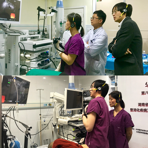 在EUS 及消化道早癌手把手培训班消化内镜中心现场,设立了超声内镜演示环节。近年来,超声内镜广泛应用于胆道及胰腺疾病的诊断,穿刺技术不断发展成熟,具有敏感性强、准确率高等优点。操作的规范性直接影响扫查结果和病理诊断。本次内镜演示与国际接轨,采用两人同台演示的形式,由长海医院徐灿教授和山东大学齐鲁医院钟宁教授共同在现场演示并深度讲解了EUS肝胆胰扫查和EUS-FNA(超声内镜引导下细针穿刺活检术)规范和指南,两位专家技术纯熟,讲解透彻,讨论热烈而深入,让与会者学习到了标准的肝胆胰扫查和穿刺技巧,为华中地区的消化医师提供了规范化、同质化的培训,对超声内镜的健康发展和规范推广有积极意义,充分体现了湖南省超声内镜学组在我省超声内镜推广和培训中重要作用。