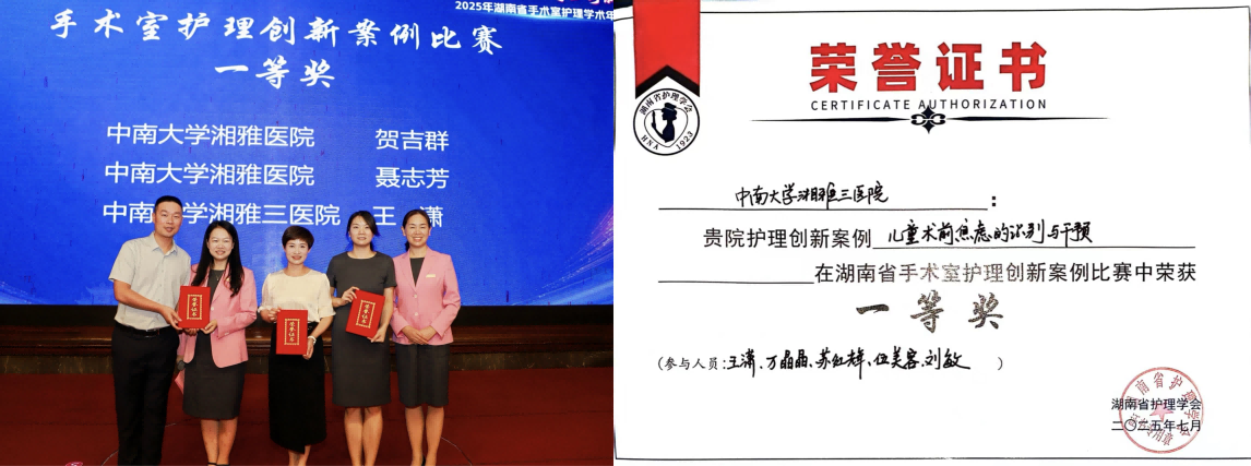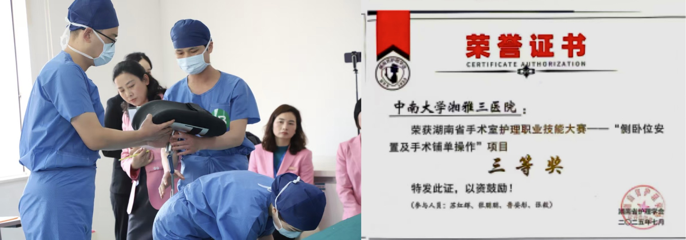 会前,新湘雅手术中心团队在湖南省手术室护理职业技能大赛中,以规范化的操作流程、精准的团队协作,在“侧卧位安置及手术铺单操作”项目中获得三等奖。该赛事聚焦手术室基础技能,强调标准化、人性化与感染控制。手术中心团队凭借规范的操作流程、严谨的工作态度、娴熟的操作技能,荣获三等奖,展现了医院手术室护理在规范化操作与专业技能方面的过硬水平。