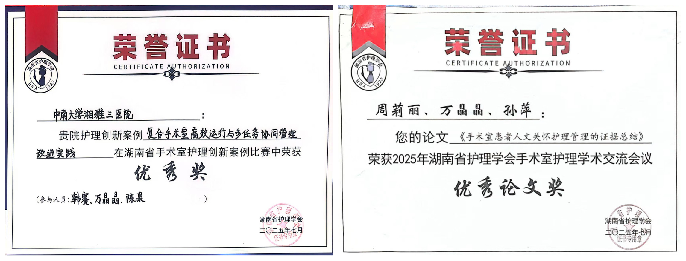 会议期间,急诊手术室万晶晶护士长负责了年会的筹办和组织工作,并在大会中做了“手术室患者人文关怀管理规范”的专题讲课,获得了参会代表的高度赞誉。此外,团队积极参与学术研讨,与国内顶尖专家就手术室质量管理、围术期低体温防控、日间手术协同等热点话题深入交流。急诊手术室周莉丽、万晶晶、孙萍投稿的“手术室患者人文关怀护理管理的证据总结”在论文专题讨论中分享了新湘雅经验,获优秀论文奖,引发同行广泛共鸣。