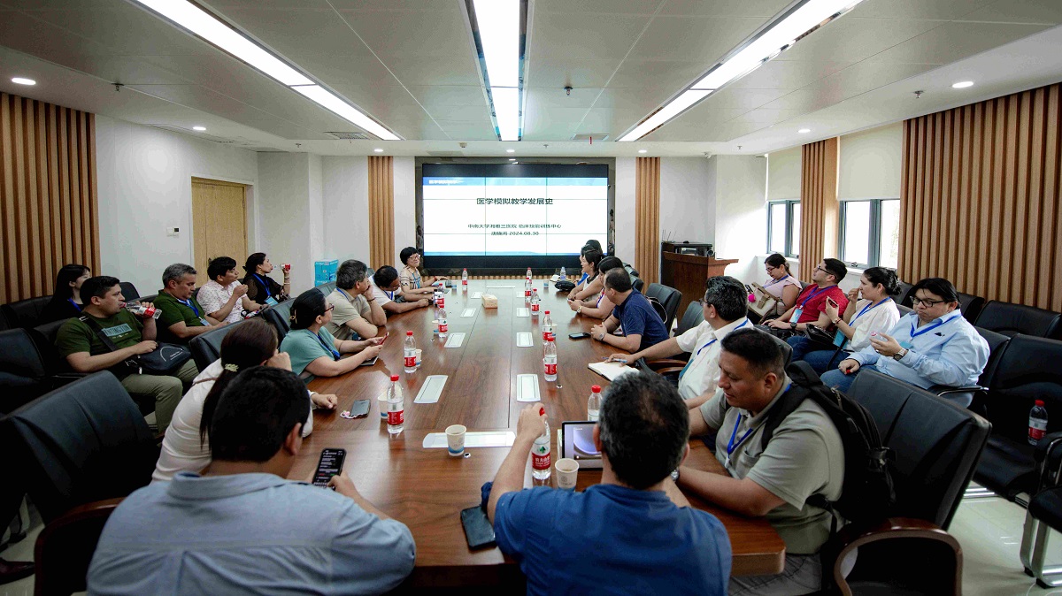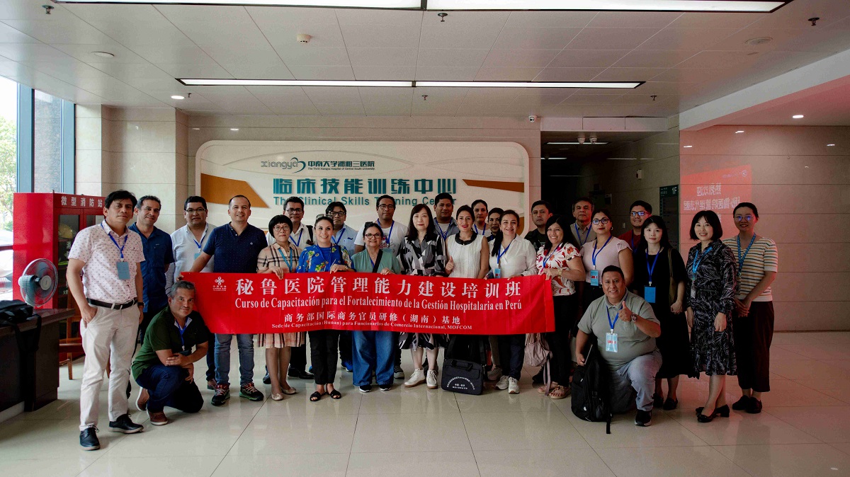 9月14日下午,由商务部主办、湖南外贸职业学院承办的秘鲁医院管理代表团一行23人来到中南大学湘雅三医院参访交流。医院党委委员、副院长左笑丛亲切会见来宾,国际合作与交流办公室会同临床技能训练中心共同承担接待工作。