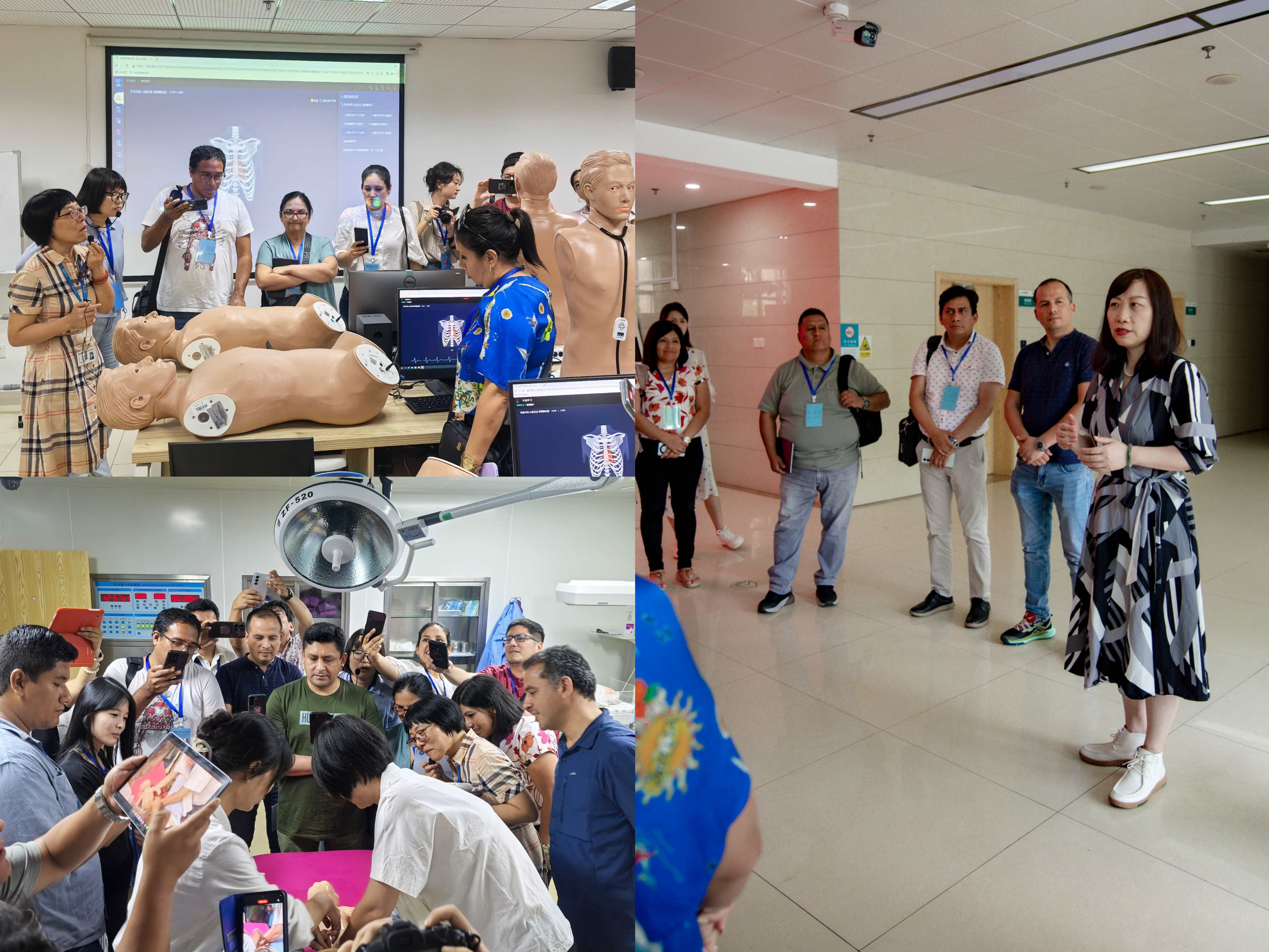 欢迎仪式之后,临床技能中心主任唐晓鸿向代表团详细介绍了医院医学模拟教学的情况,并带领代表们沉浸式参观体验了临床技能中心的多个训练场地,包括模拟急诊室、模拟产房、临床思维训练室、微创腔镜训练室、OSCE考站等。