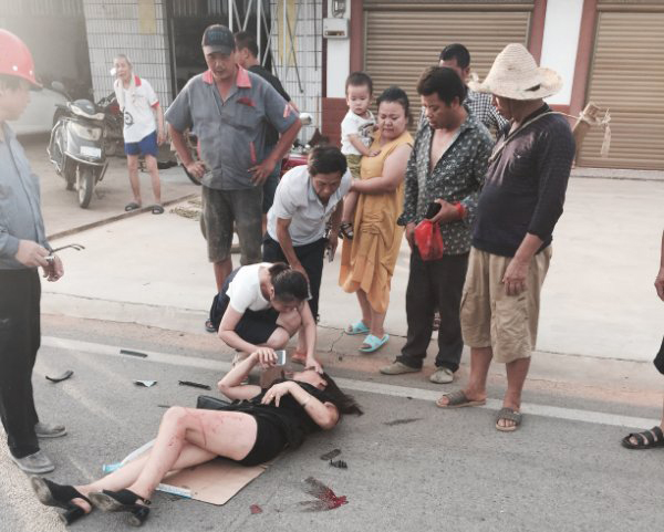 2018年7月27日下午6点半,宁乡市鲁塘村086县道发生一起小轿车与摩托车相撞的车祸,中年女性摩托车车主被撞伤倒地且情绪非常不稳定。现场围观的群众越来越多,却无人敢上前施救,都在一旁默默地等待救护车的到来。湘雅三医院120急救中心女护士康晓艳正好开车经过,发现这一事故后立即下车查看伤者并对其全身进行了伤情评估。