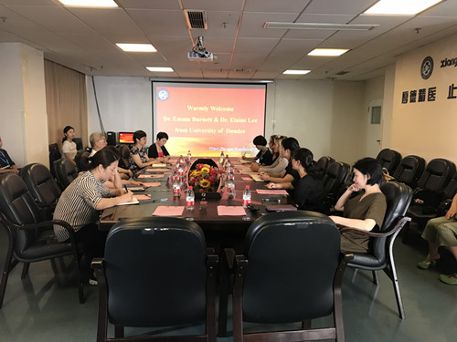 7月3日下午,中南大学湘雅三医院与英国邓迪大学在医院外科楼十九楼会议室举行护理合作交流会。来自英国邓迪大学的护理与健康科学学院外事副院长Emma Burnett、科研副院长Elaine Lee到访。医院党委委员、副院长朱晒红,护理部,国际合作与交流办公室,护理教研室,护理科研小组成员等30余人参加交流会。会议由国际合作与交流办公室主任刘新春主持。