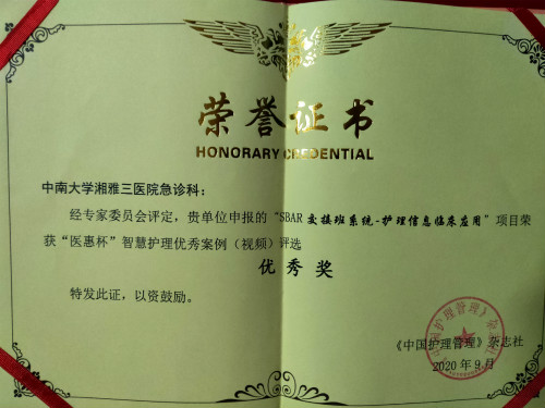 9月4日,由国家卫生健康委医院管理研究所指导,《中国护理管理》杂志社主办,以“使命·担当·成长”为主题的“2020中国护理管理大会”在广东省珠海市召开,湘雅三医院急诊科申报的案例“SBAR交接班系统—护理信息临床应用”获优秀奖。