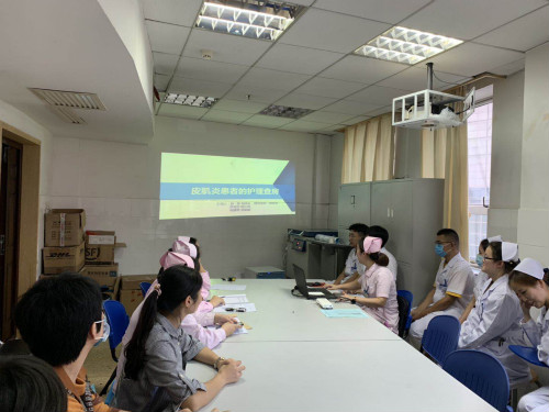 此外,为提高护理实习生临床思维能力,更好地提升护理服务质量,9月24日下午,肾病风湿科结合科室近期病种特点,由护士长吴琼英负责主持,组织护理实习生开展了一次以“全面了解肌炎、促进肺康复”为目的的护理查房。本次护理查房的对象是一位皮肌炎的患者,由中南大学湘雅护理学院6位实习同学在总带教周钰琼的指导下查找文献资料并结合临床实践,分别从病例汇报、鉴别诊断、疾病介绍、护理诊断及措施、肺康复操演示等进行了汇报。