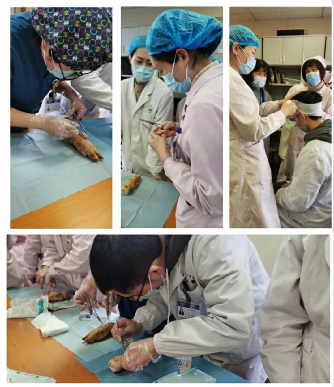 实践活动中,小组组长卜平元副主任护师,副组长阳萍副主任护师分别现场为大家演示伤口清创操作及简单包扎固定,使学员对伤口造口的护理有了更为直观的认识。所有成员分组操作,在不同的伤口模型上进行现场清创和简单的包扎固定。
