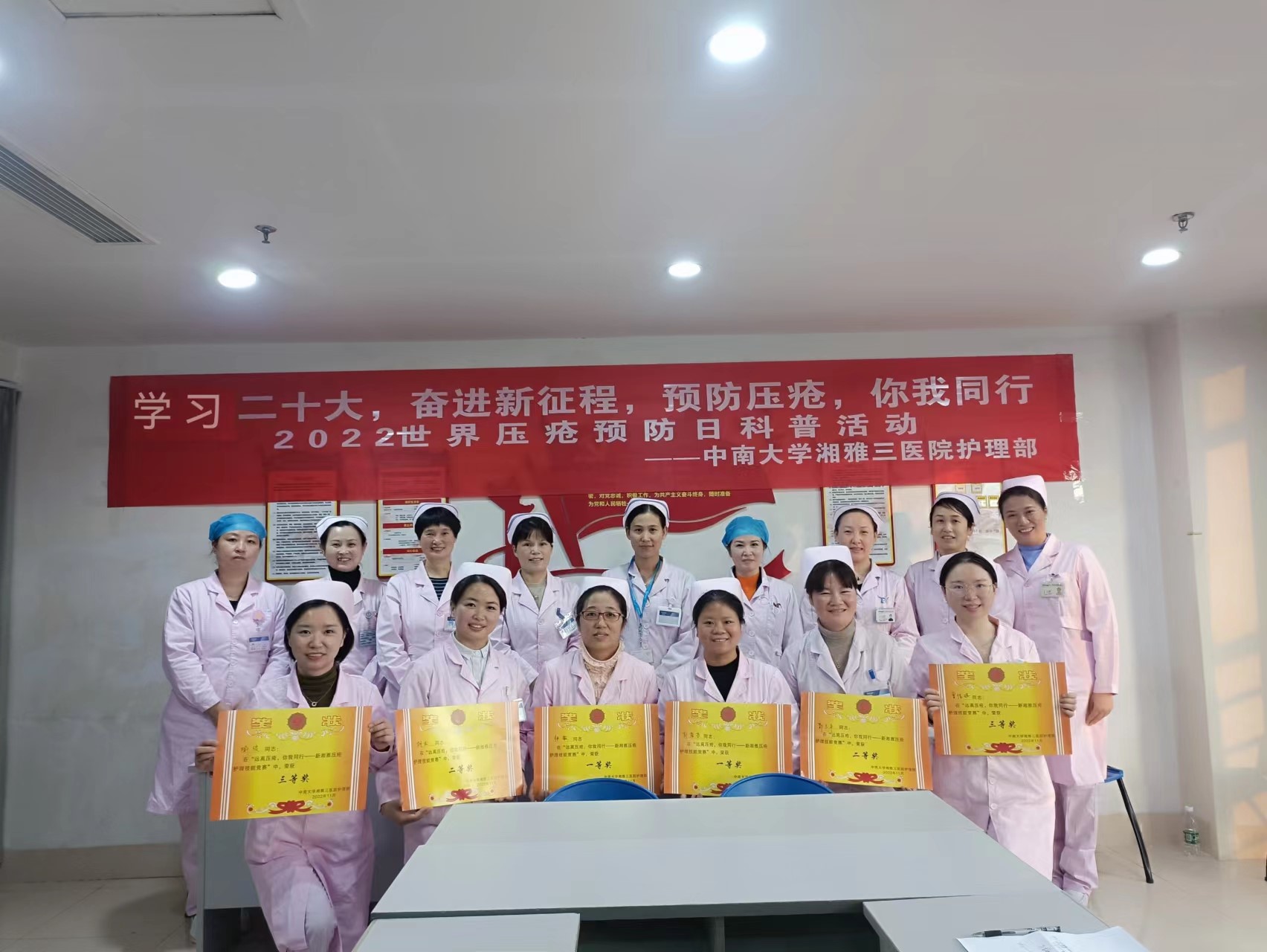 本次活动在生动的图文科普宣教知识中拉开帷幕。神经内科ICU张丽娟主讲,招募院内30余名压疮照护者共同进行,分为科普宣教和知识抢答两个环节。科普宣教结束后,来自伤口造口护理小组、压疮护理小组的6人组成技能竞赛队伍开展了压疮护理技能竞赛,主要考评选手们对压疮的评估、预防、处理、健康宣教四个环节的临床思维,竞赛过程中,选手们的精神面貌充分展示出新湘雅人专业的技能和团结向上的团队合作精神。经过激烈的角逐,最终彭蓉芬、张毅获一等奖,胡蛟、郭兰平获二等奖,曾佳琪、喻俊获三等奖。