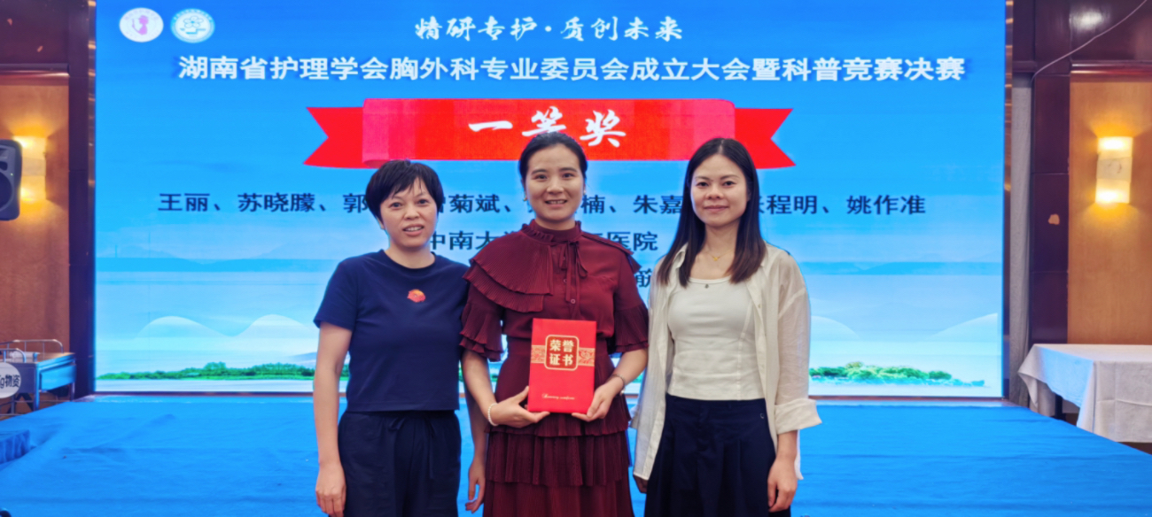 2025年9月5日至7日,湖南省护理学会胸外科专业委员会成立大会暨2025年胸外科护理学术年会在长沙召开。此次大会以“护胸健行,科守护航”为主题举办了科普竞赛,中南大学湘雅三医院心胸外科护理团队凭借健康宣教视频《术后不“僵”住,锻炼“活”筋骨》,从全省30余个优秀参赛作品中脱颖而出,荣获一等奖。