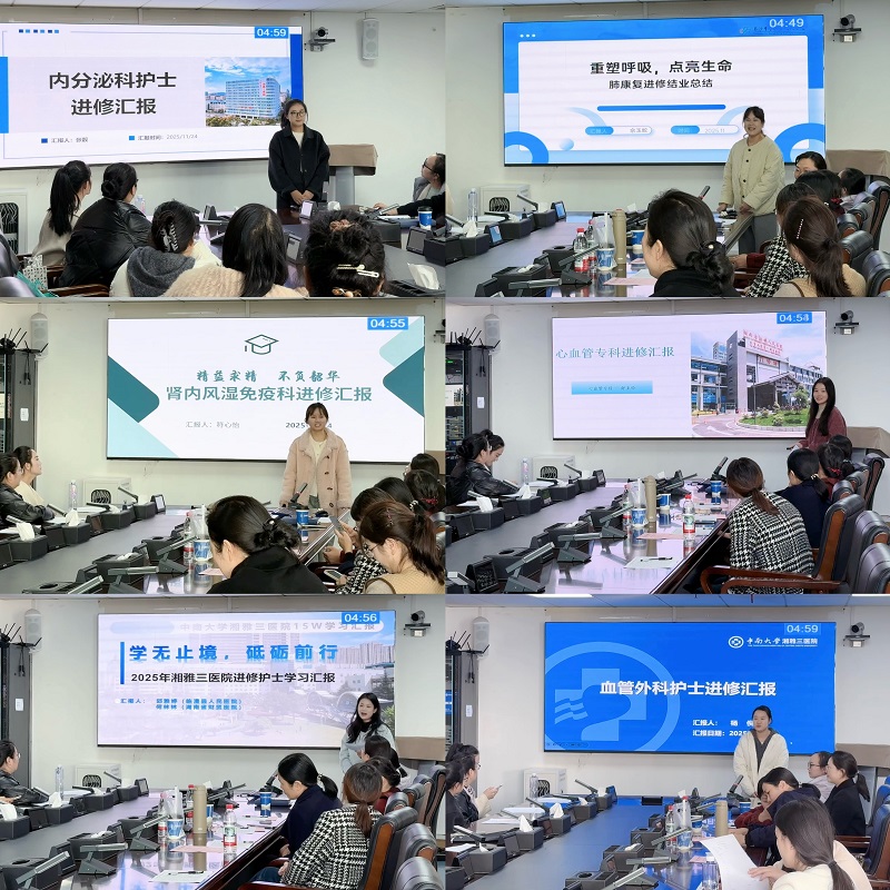 11月24日下午,中南大学湘雅三医院护理学教研室于外科楼19楼会议室进行2025年第3期进修护士结业汇报会。护理学教研室副主任戴婵媛,湖南省护理学会耳鼻喉专业委员会主任委员王芳老师,进修科室护士长代表及本期全体进修护士参会,会议由护理学教研室副主任黄辉主持。此次会议以“深化专业赋能、践行3H文化”为主线,通过结业汇报、专家点评、总结寄语等环节,全面展示本期进修成果,彰显医院作为教学医院在护理人才培养领域的责任担当。