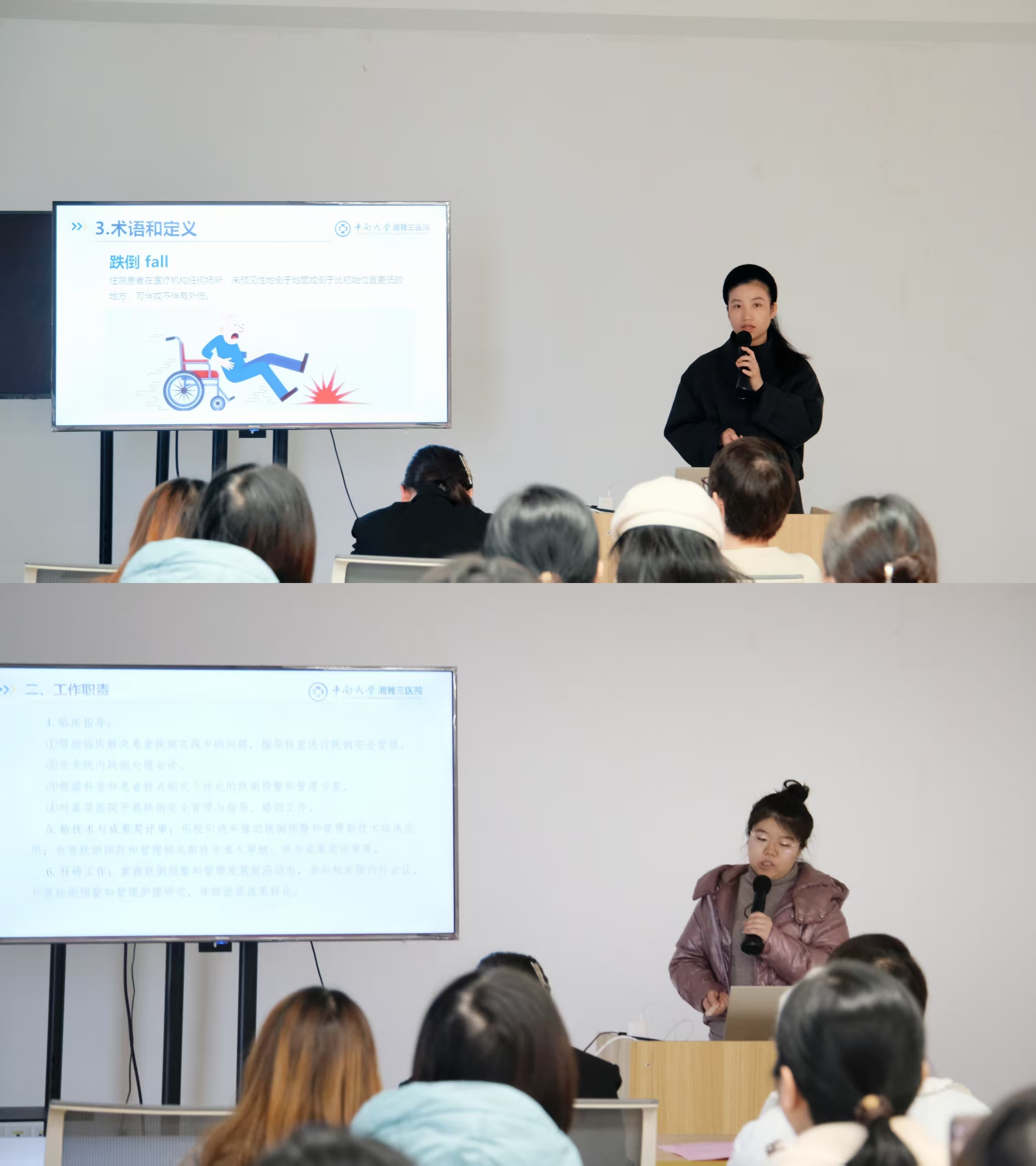 血液内科一病区主管护师、跌倒安全管理小组秘书石双姣汇报了《跌倒安全管理小组工作方案》,明确了小组的工作目标、职责分工、未来的工作计划和发展方向,制定了跌倒应急预案及处理措施,为促进全院患者跌倒安全管理奠定了坚实的基础。感染科病区护士长、跌倒安全管理小组副组长李秋艳以《跌倒风险评估与预防》为主题开展了首次专题培训,详细讲解了成人住院患者跌倒风险评估与预防团体标准,内容涵盖患者入院后跌倒评估预防的具体流程、评估方法和干预措施,为小组成员提供了宝贵的专业指导。