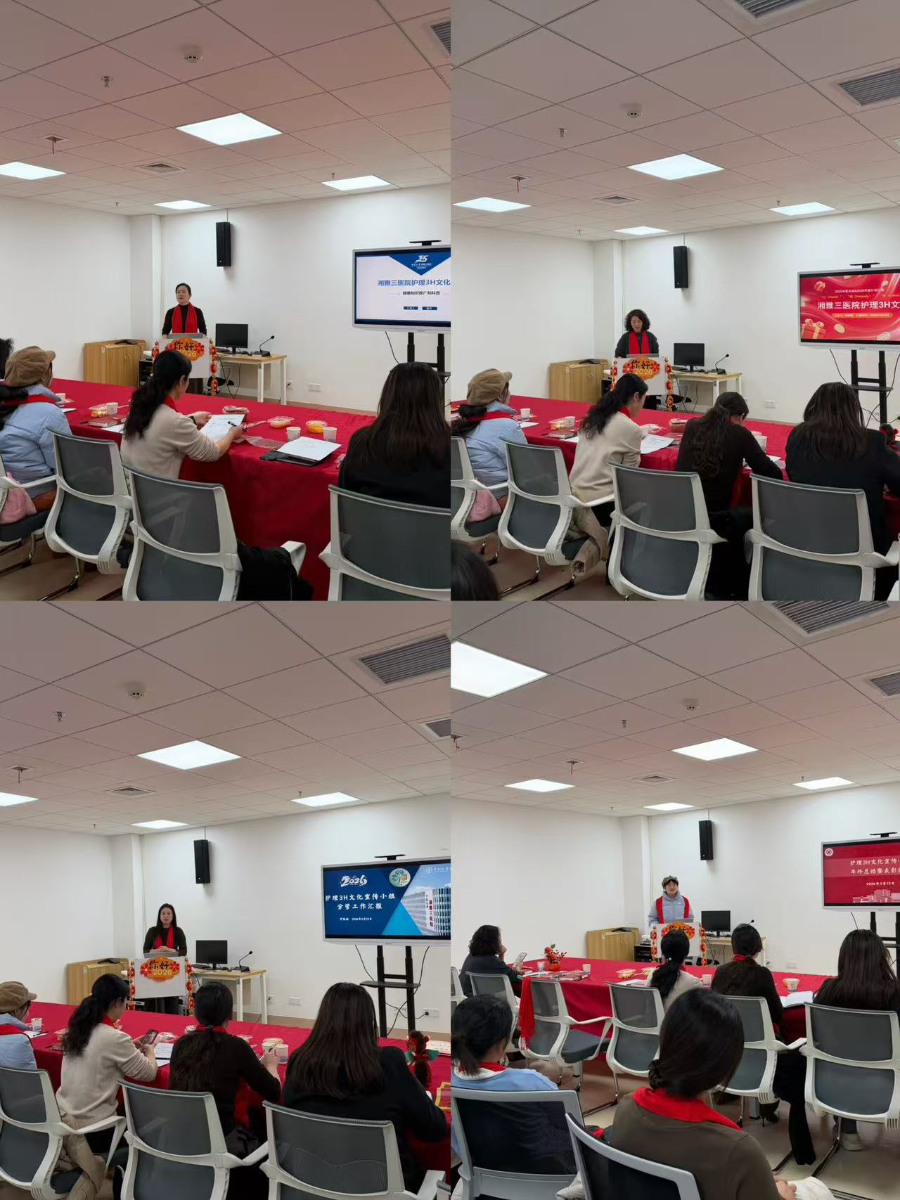 康丹、崔丽娜、罗佩佩三位副组长分别从健康科普宣传、官网宣传、护士形象、平台运营、活动组织等维度,系统汇报年度工作成果、复盘问题及思考,明确下阶段工作重点与行动计划,为小组高质量发展理清路径、细化举措。李丹基于如何通过各类形式素材展示多元护理文化,以及患者科普、宣传平台建设给予点评与建议。易琦峰对小组全年工作给予充分肯定,强调3H文化宣传是新湘雅护理品牌建设的重要抓手,要持续以“心(Heart)、诚(Honesty)、家(Home)”为内核,讲好护理故事、传播护理声音、彰显人文温度,引领团队文化与精神。