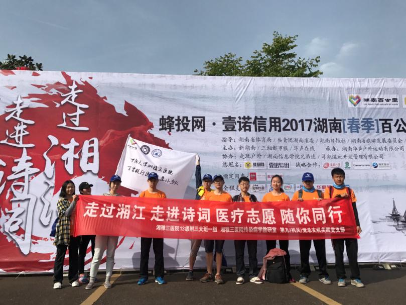 近日,在湘雅三医院教务部组织下,13级临五附三大班一组的同学在传染病学教研室刘欣瑜老师带领下,组建了一支医疗志愿小分队,参与了湖南省第7届百里毅行活动。医疗小分队从洋湖湿地公园出发,高举中南大学湘雅三医院的旗帜一路南去,徒步行走50公里的路程。一路上,宣传春季传染病防治知识,传播湘雅精神,并为百里毅行的其他参与者提供力所能及的基本医疗服务。