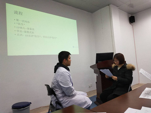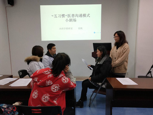 11月17日晚,在2014级五年制同学的一堂临床见习指导课上,内科学教研室张帆老师根据同学们的实际情况以及血液系统疾病的特点,将“五习惯”医患沟通模式以情景模拟小剧场的方式搬到了课堂上。整场活动均由老师和同学们自导自演,将日常诊疗过程中的情景再现,然后按照“五习惯“模式进行点评和改进。